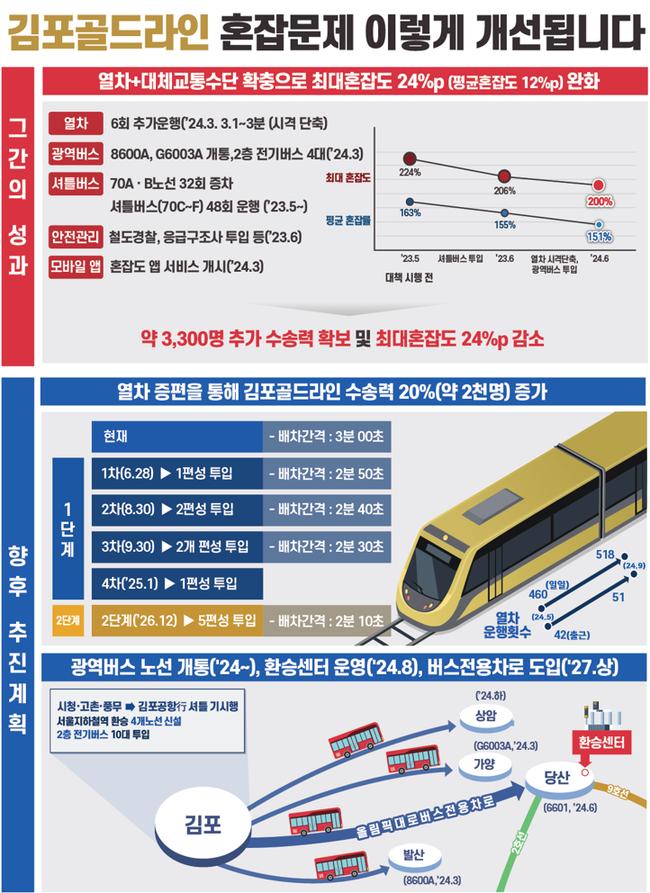 국토부는 작년 5월부터 열차 시격조정, 셔틀버스(고촌·풍무 아파트단지→김포공항) 투입, 승강장 안전활동 강화 등 김포골드라인 혼잡완화를 위해 노력해 왔으며, 이번 열차 증편으로 수송력이 20% 증가하는 만큼 상당한 추가 혼잡완화 효과가 있을 것으로 기대하고 있다.