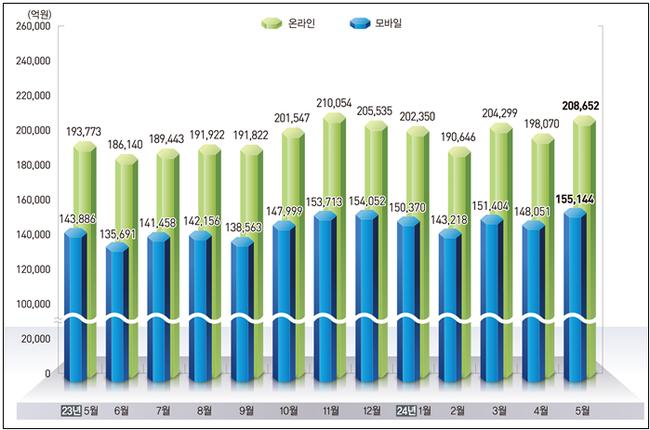통계청이 7월 1일 발표한 `5월 온라인쇼핑 동향`에 따르면, 2024년 5월 온라인쇼핑 거래액은 전년 동월 대비 7.7% 증가한 20조 8,652억 원으로 역대 최대치를 기록했다. 이 중 모바일 쇼핑 거래액은 15조 5,144억 원으로 전년 대비 7.8% 증가하여 전체 온라인쇼핑 거래액의 74.4%를 차지했다.