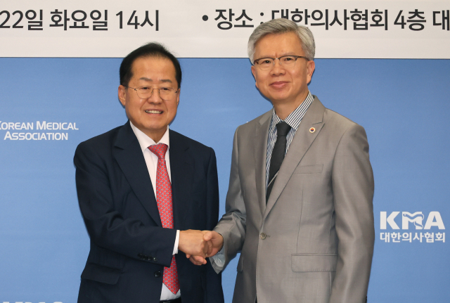 홍 후보는 이날 의협의 김택우 회장, 박단 부회장 등과 만나 "결국 정부가 무너지게 된 첫 번째 단초가 의료계와의 충돌"이라며 "대선을 계기로 새 정부가 생기면 즉시 해결할 수 있는 방책을 찾기 위해 (의협을) 찾았다"고 말했다.