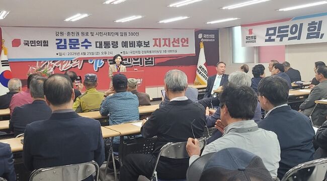 강원도는 이에 화답하기라도 하듯 ·춘천 원로 및 시민사회단체 임원 300인은 ‘김문수 대통령 예비후보 지지선언’을 했고 이들은 선언문을 통해 “우리 춘천이 청백리 김문수를 지지하고 차기 대통령으로 선택함으로써 다시 한 번 대한민국을 구하는 데 앞장서자”고 밝히기도 했다.