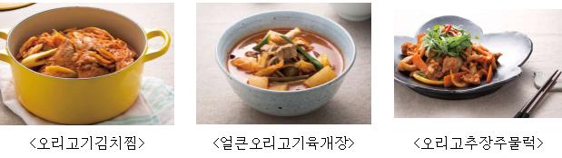 농촌진흥청은 오리고기를 활용한 친숙한 가정식 메뉴로 ▲묵은지와 오리고기를 함께 끓인 ‘오리고기김치찜’ ▲통오리를 우려낸 국물에 나물과 함께 매콤하게 끓인 ‘얼큰오리고기육개장’ ▲양념에 버무려 채소와 함께 볶아 먹는 ‘오리고추장주물럭’을 제안했다.