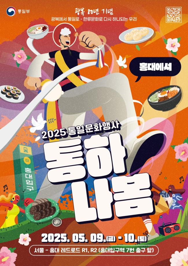 통일부는 5월 9일(금)부터 10일(토)까지 서울 홍대 레드로드 광장에서 “광복 80년 기념, 한류문화로 다시 하나되는 우리-광복에서 통일로”라는 주제로 2025년 통일문화행사 「홍대에서 통하나봄」을 개최한다.