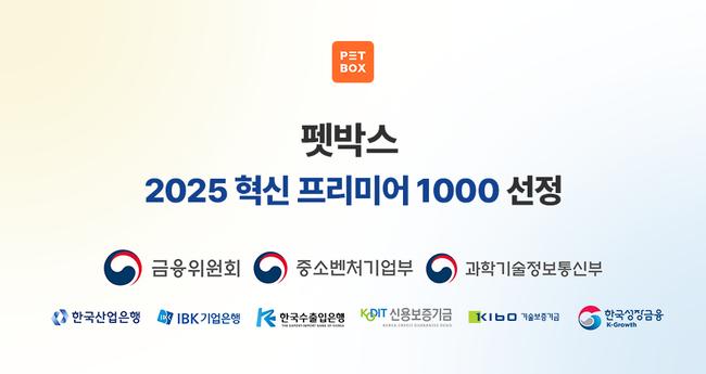 펫박스(대표 이현석)는 중소벤처기업부와 과학기술정보통신부의 동시 추천을 받아 `2025년 제1차 혁신 프리미어 1000`에 최종 선정됐다.