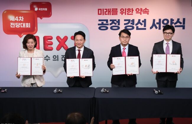 국민의힘 7·23 전당대회에 출마한 후보자들이 한목소리로 '공정경선'을 약속했다. 그간 당 지도부는 당권주자들 간 경쟁이 과도한 비방전으로 이어지는 데 대해 우려를 표하기도 했지만 '미래를 위한 약속, 공정경선 서약식'을 통해 결과에 관계없이 하나가 되자는 취지에 공감했다.