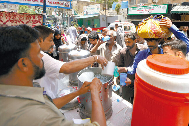파키스탄 카라치에 시민들이 열사병 예방을 위해 제공된 설탕물을 받으려고 몰려들었다.