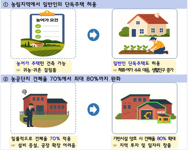 국토부 이상주 국토도시실장은 “이번 개정은 귀농·귀촌과 주말 영농 등 생활형 정주 수요를 뒷받침하는 실효적 조치”라며 “농공단지와 개발 규제 완화를 통해 지역 일자리와 투자 확대에도 기여할 것”이라고 강조했다.