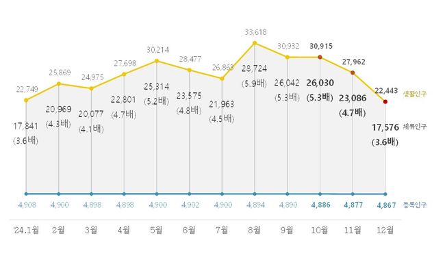 행정안전부는 26일 ‘2024년 4분기 인구감소지역 생활인구 산정 결과’를 발표하며, 지난해 12월 기준 인구감소지역의 생활인구가 약 2,244만 명, 이 중 체류인구가 약 1,757만 명으로 등록인구의 약 3.6배에 달한다고 밝혔다.