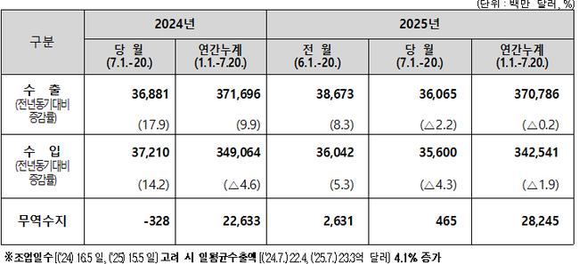 관세청이 21일 발표한 ‘2025년 7월 1~20일 수출입 현황’에 따르면, 해당 기간 수출은 361억 달러, 수입은 356억 달러로 집계됐다. 전년 동기 대비 수출은 2.2%(8.2억 달러), 수입은 4.3%(16.1억 달러) 각각 감소했지만, 무역수지는 5억 달러 흑자를 기록하며 전환에 성공했다.