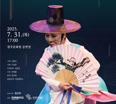 강원문화재단(대표이사 신현상)은 7월 31일(목) 오후 5시 원주문화원 공연장에서 전통 무용가 정선자가 선보이는 한국 전통무용 공연 「전통의 숨결, 예인의 무대 – 정선자의 춤」을 개최한다.