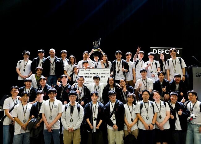 ▲ 미국 현지시간 8일 라스베이거스에서 열린 ‘AI 사이버 챌린지’에서 삼성전자와 국내외 주요 대학이 연합해 출전한 ‘팀 애틀랜타(Team Atlanta)’가 우승 기념 단체 사진을 찍고 있다.