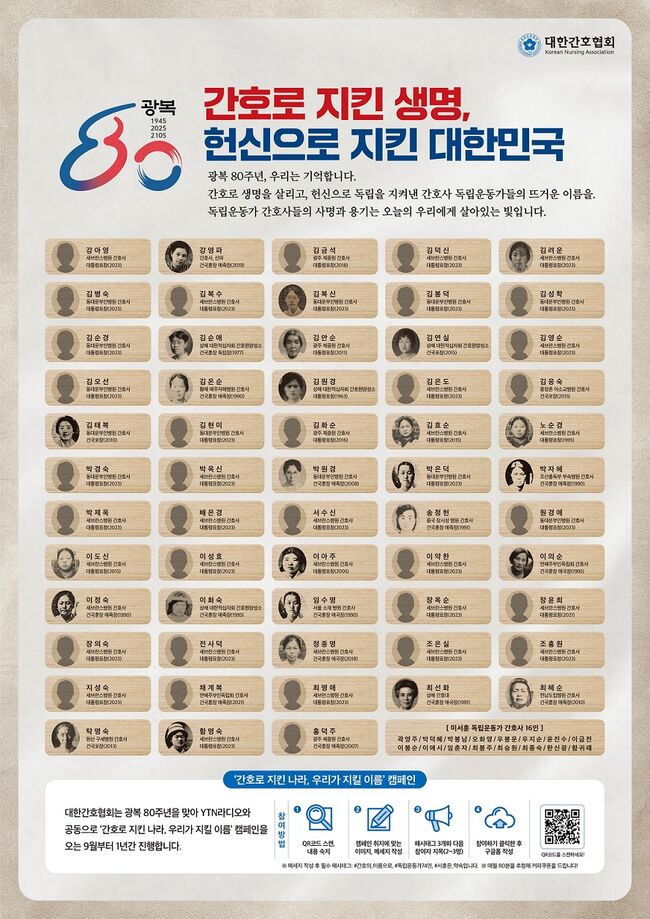 아울러 간호협회는 YTN라디오와 함께 ‘대한민국을 간호하다’ 시즌2를 오는 9월부터 2026년 8월까지 1년간 공동 제작한다. 해당 프로그램은 15인의 독립운동가 간호사 이야기를 120초 분량의 스토리텔링으로 담아 하루 3회 송출한다. 이정숙, 노순경, 이애시, 한신광 등 국내외에서 독립운동과 간호 활동을 병행했던 여성 독립운동가들의 삶이 조명된다.