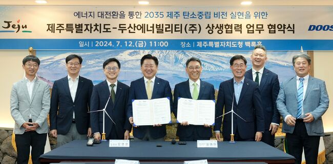 오영훈 지사는 “국가 목표보다 15년을 앞서 2035 탄소중립을 실현하겠다는 것이 제주의 담대한 비전”이라며 “제주도와 두산에너빌리티가 각자의 전문성과 역량을 결집하면 에너지 대전환과 탄소중립을 앞당기고 제주를 세계적인 그린수소 메카로 만드는 새로운 전기가 될 것”이라고 전했다.