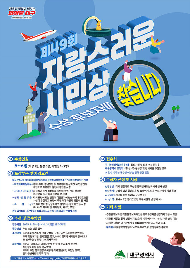 대구광역시는 지역사회 발전을 위해 헌신하고 선행과 효행으로 타의 모범이 되는 시민을 발굴해 시상하기 위해 8월 29일(금)부터 10월 24일(금)까지 ‘제49회 자랑스러운 시민상’ 후보자를 공개 모집한다.