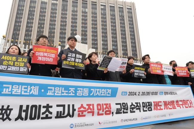 지난 2월20일 열린 `故 서이초 교사 순직 인정 및 순직인정 제도 개선 촉구 기자회견`에서 여난실 한국교총 회장직무대행(왼쪽 네번째)이 공동성명서를 읽는 모습