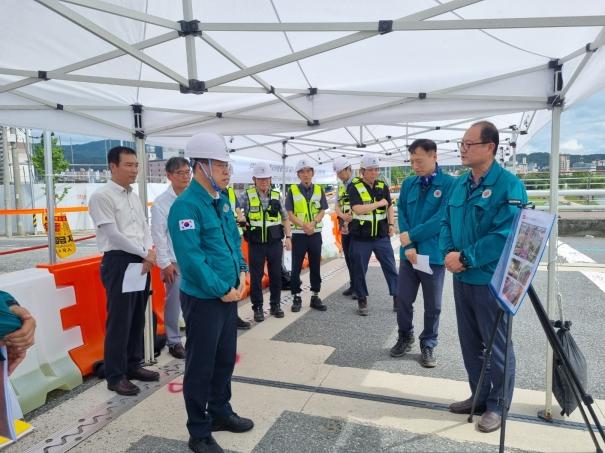 진현환 국토부 제1차관은 7월 14일 오후 대전 유등교 바닥판 침하사고 현장을 방문하여 피해상황을 점검하고 신속한 복구 및 철저한 안전관리를 강조했다.