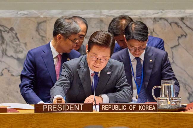 이재명 대통령이 24일(현지시간) 미국 뉴욕 유엔본부에서 안전보장이사회 공개 토의를 주재하고 있다.