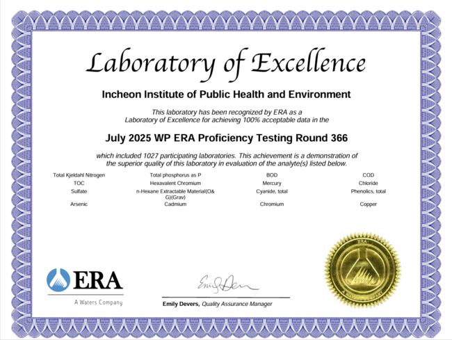 인천광역시(시장 유정복) 보건환경연구원은 미국 환경자원협회(ERA)가 주관한 2025년 환경분야 국제숙련도 평가에서 ‘최우수 등급(Laboratory of Excellence)’을 받았다고 밝혔다. 이번 성과로 연구원은 11년 연속 최우수 등급을 유지하게 됐다.