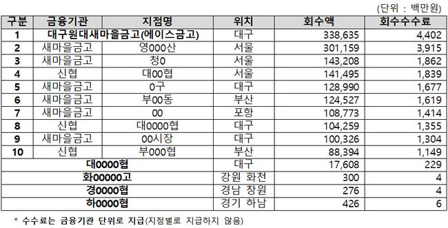 기관당 평균 수수료는 약 2천만 원 수준이었다. 그러나 대구의 한 새마을금고는 부정유통으로 적발된 가맹점 3곳과 거래하면서 약 44억 원의 회수수수료를 챙겨 전국 1위를 기록했다. 이는 금융기관 평균의 약 220배, 전체 지급액의 5.7%에 해당한다.