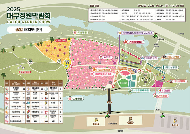 대구광역시는 일상 속 정원문화를 확산하고 도심 속 녹색 힐링공간을 선보이는 ‘2025 대구정원박람회’를 10월 24일(금)부터 28일(화)까지 5일간 금호강 하중도 일원에서 개최한다.