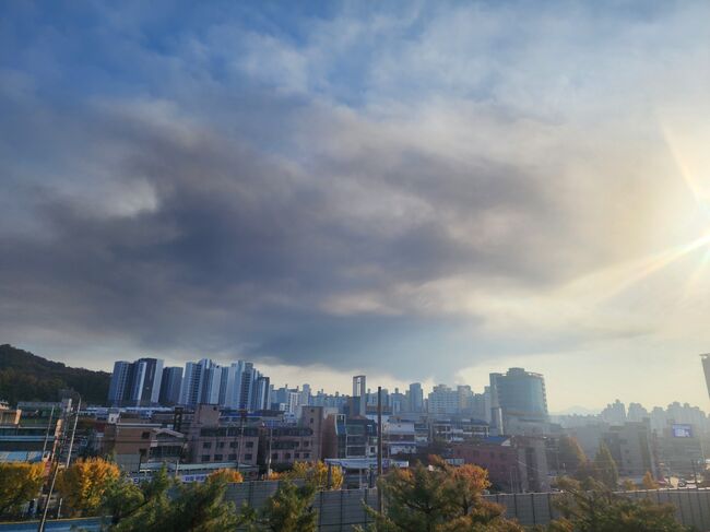 천안 하늘을 가린 지난 15일 천안 이랜드패션 물류센터에서 불과 연기