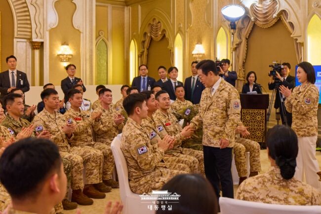 UAE 파견 국군부대인 아크부대 장병들을 만나 격려하는 대통령 부부