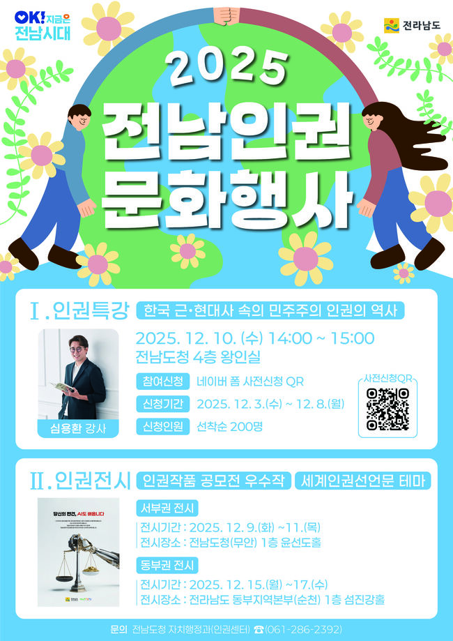 전라남도가 세계인권선언 77주년을 맞아 인권 문화 확산을 위해 오는 9일부터 17일까지 인권 특강, 인권공모전 우수작 전시회 등 ‘2025 도민인권증진 문화행사’를 연다.
