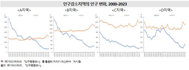 보고서에 따르면 인구감소지역의 인구 ‘자연적 감소’는 총인구가 자연감소로 전환된 2020년보다 약 20년 앞선 2000년 전후부터 시작됐다. 인구감소지역의 ‘사회적 감소’는 20대 연령층의 순유출이 핵심 요인으로, 지난 20년(2001~2020년) 연평균 인구증감률이 가장 낮은 4개 지역 모두 20대 순유출이 두드러졌다.
