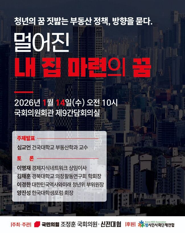 주제 발표는 심교언 건국대학교 부동산학과 교수가 맡아, 현행 부동산 정책의 구조적 문제와 청년 주거 정책의 개선 방향을 분석할 예정이다.