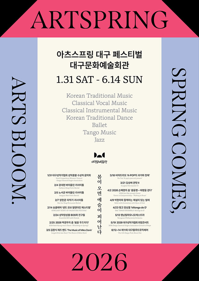 대구문화예술회관(관장 김희철)은 대구를 기반으로 활동하는 지역 예술인들의 공연을 한데 모아 그들의 예술혼을 집중 조명하는 축제 〈2026 아츠스프링 대구 페스티벌〉의 16개 공연을 오는 1월 31일(토)부터 6월 14일(일)까지 대구문화예술회관에서 개최한다고 밝혔다.