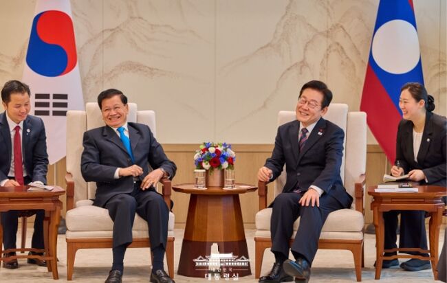 12만에 공식 방문한 통룬 시술릿 라오스 국가주석과 환하게 웃고 있는 이재명 대통령