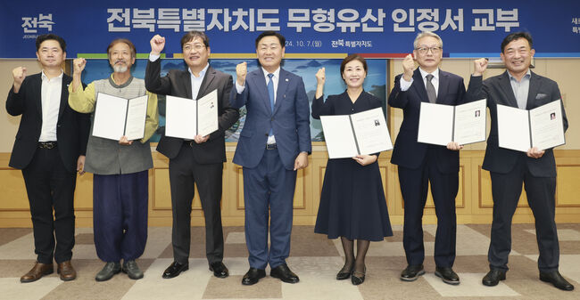 전북특별자치도는 7일 도청 회의실에서 무형유산으로 신규 지정된 보유자 및 보유단체를 대상으로 “인정서 전달식”을 개최하였다.