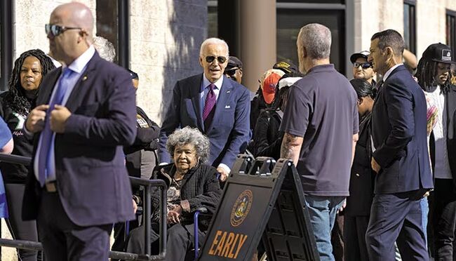 조 바이든 미국 대통령은 미 델라웨어주(州) 뉴캐슬의 사전 투표 현장에 나와 40분간 기다린 끝에 투표를 마친 후 “우리(민주당)가 이길 것”이라고 했다. 이날 바이든 대통령은 투표하기 위해 줄을 서서 기다리는 동안 한 유권자의 휠체어를 밀어주는 모습을 연출하기도 했다.