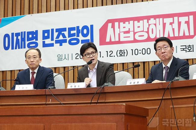 국민의힘 한동훈 대표가 12일 국회에서 열린 `이재명 민주당의 사법방해저지 긴급대책회의`에서 발언을 하고 있다.