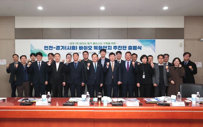 경기도는 12일 인천 송도 미추홀타워에서 ‘인천-경기시흥 바이오특화단지 추진단’ 출범식을 열고 바이오 특화단지 발전방향을 논의했다.