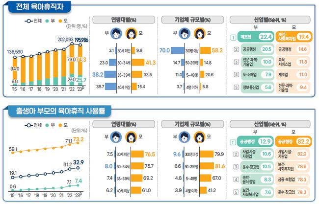 출산휴가자도 감소세를 보였다. 2023년 출산휴가자는 엄마가 7만 2,947명, 아빠가 1만 5,375명으로 전년 대비 각각 0.6%, 6.1% 감소했다.