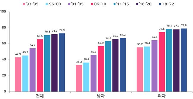 암 생존율은 지난 20년간 꾸준히 증가해 2001~2005년의 54.2%에서 최근 72.9%로 18.7%p 상승했다. 성별로는 여성이 78.8%로 남성(67.2%)보다 높았으며, 생존율이 높은 암종으로는 갑상선암(100.1%), 전립선암(96.4%), 유방암(94.3%)이 포함되었다. 반면 췌장암(16.5%)과 간암(39.4%)은 생존율이 낮은 암종에 속했다.