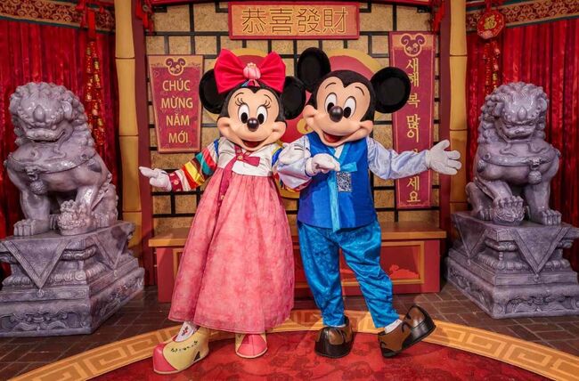 예년과 달리 한복을 입은 미키마우스와 미니마우스가 방문객들과 함께 기념사진을 찍는가 하면 한국 무용수들의 축하 공연과 함께 ‘새해 복 많이 받으세요’라는 축하 인사가 한국어·중국어·베트남어로 함께 걸렸다.