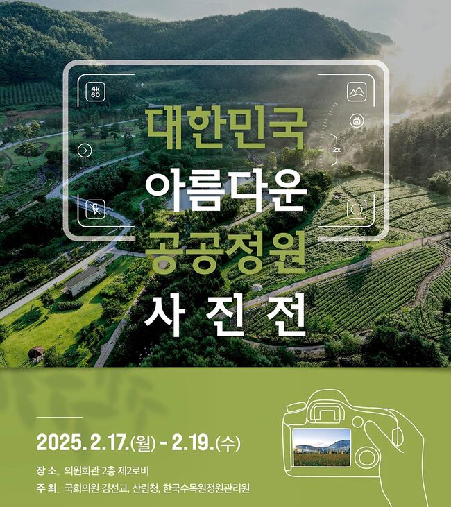 국회 농림축산식품해양수산위원회 김선교 의원 ( 국민의힘 , 여주시 ‧ 양평군 ) 은 국회에서 산림청 ( 청장 임상섭 ), 한국수목원정원관리원 ( 이사장 심상택 ) 과 함께 ‘ 대한민국 아름다운 공공정원 사진전 ’ 을 공동 개최한다 .