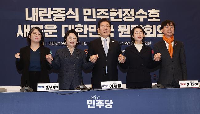 이재명 더붕어민주당 대표가 2025.02.19.(수) 국회 본청 316호에서 열린 내란종식 민주헌정수호 새로운 대한민국 원탁회의 출범식에 참석하여 기념 촬영을 하고 있다.