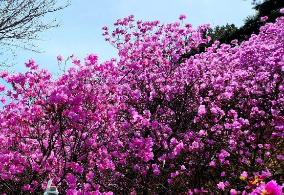 진달래는 3월부터 4월에 핀다. 진달래는 꽃이 먼저 피고 나중에 잎이 피고 철쭉은 꽃과 잎이 동시에 피기 때문에 꽃만 달랑달랑 피어있으면 진달래로 꽃과 잎이 푸짐하게 피어있으면 철쭉이다.