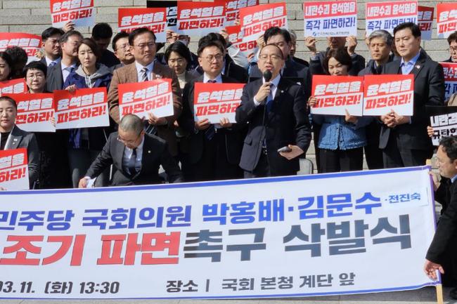 더불어민주당 김문수 의원(전남 순천광양곡성구례갑)이 11일 박홍배·전진숙 의원과 함께 윤석열 대통령 파면을 촉구하며 삭발을 단행했다.