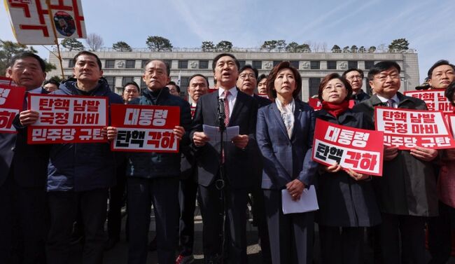 권성동 원내대표는 "탄핵소추문에 내란이라는 단어가 38번 들어갔고 탄핵소추 사유 1번이 내란 범죄행위"라며 "내란 혐의는 대통령 탄핵소추문의 알파이자 오메가인데 탄핵 사유에서 제외한다면 앙꼬 없는 찐빵이 아니라 찐빵 없는 찐빵"이라며 "우리가 바라는 것은 탄핵 기각"이라고 말했다.
