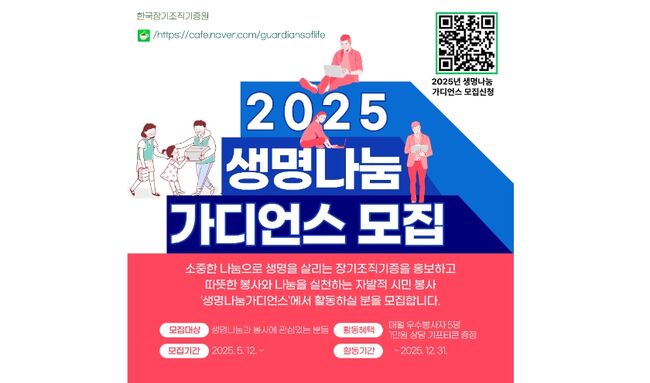 한국장기조직기증원(기관장: 이삼열)은 2025년 생명나눔 문화를 확산하기 위해 자발적 시민 봉사자 ‘생명나눔 가디언스’를 모집한다.
