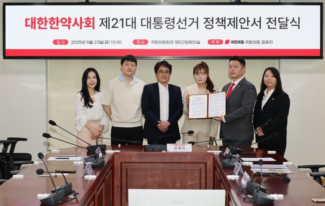 대한한약사회는 23 일 국회에서 국민의힘 김예지 의원 ( 비례대표 , 재선 ) 에게 한의약 관련 정책제안서를 전달했다 .