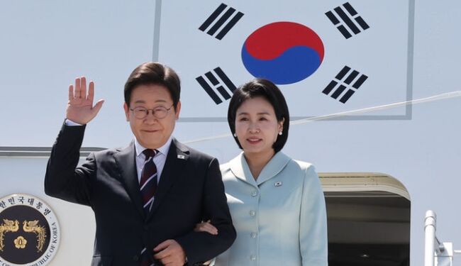 이재명 대통령이 주요7개국(G7) 정상회의에 참석하기 위해 캐나다 앨버타주 캘거리국제공항에 도착해 김혜경 여사와 공군 1호기에서 내리며 인사를 하고 있다.