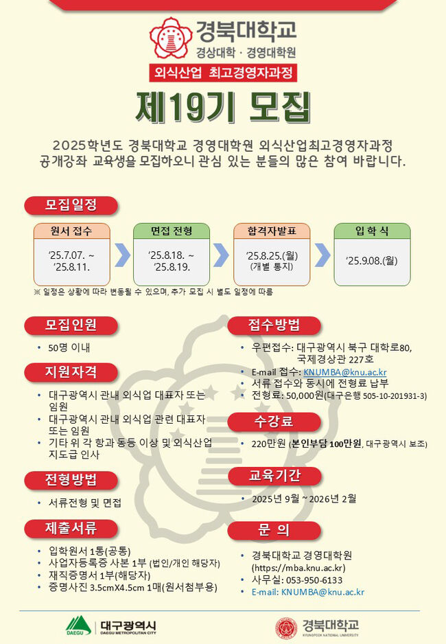 대구광역시는 지역 먹거리산업을 선도할 외식전문 경영인 양성을 위해 ‘외식산업 최고경영자 과정’ 제19기 수강생을 모집한다.