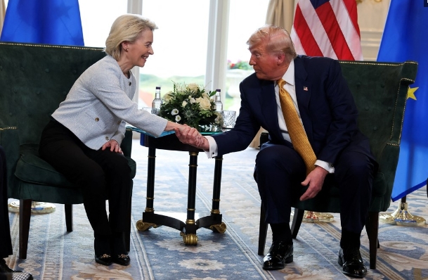 27일 트럼프 미국 대통령과 우르줄라 폰데어라이엔 EU 집행위원장이 영국 스코틀랜드에서 한 시간 반가량 회동한 뒤 15% 관세율에 합의했다고 발표했다.
