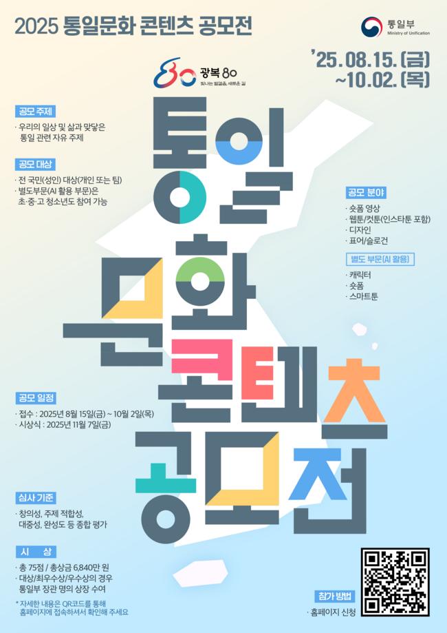 통일부는 관심 있는 분들의 적극적인 참여를 바라며, 특히 광복 80년과 통일의 의미를 함께 아우르는 작품들이 많이 출품되기를 기대한다.