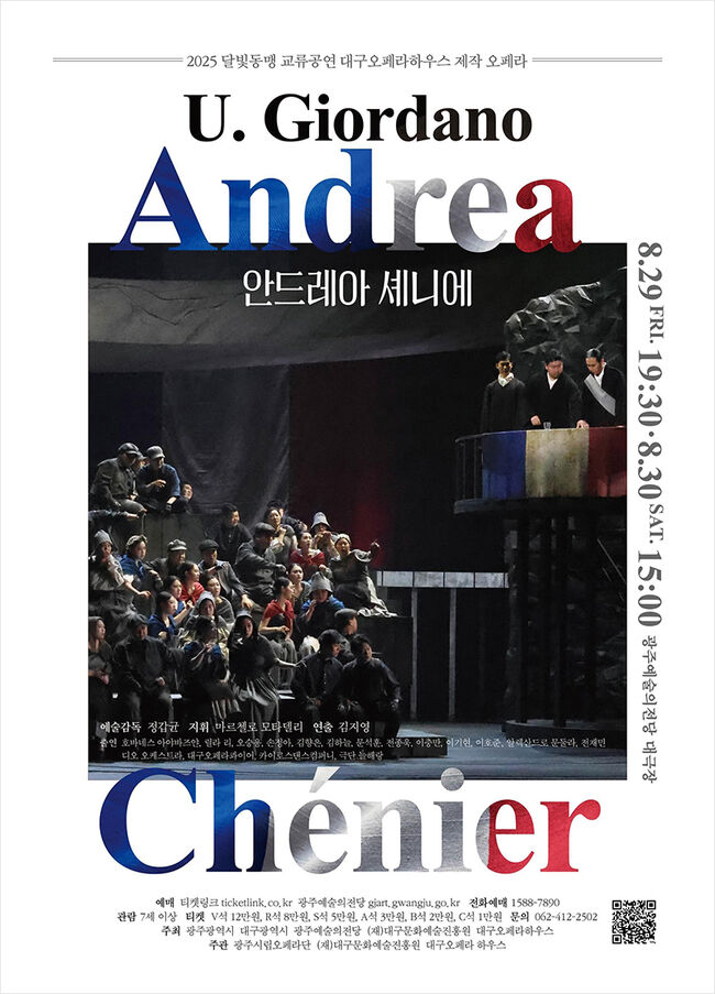 광주예술의전당에서 펼쳐지는 오페라 ‘안드레아 셰니에’는 8월 29일(금) 19시 30분, 30일(토) 15시에 관객들을 만난다. 입장권은 2만원에서 12만 원까지로, 만 7세 이상 관람이 가능하다. 예매 및 할인 정보는 광주예술의전당 누리집과 티켓링크를 통해 확인 할 수 있다.