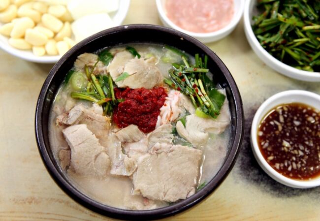 • '부산 돼지국밥(돼지국밥, Dwaeji-gukbap)'은 돼지 뼈 육수에 돼지고기, 간장, 된장, 참기름, 소주 등을 넣은 부산의 대표 소울푸드로, 밥을 말아 내는 따뜻한 한 끼 메뉴입니다